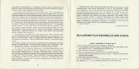 | Ансамбъл „Пирин” – Благоевград, 1. На ти, моме, свири 1'22" 2. Я ти постилам шарени черги 2'36" 3. Кавали свирят 3'14" 4. Какво е цвете цъфнало 2'04" 5. Вила се и гора 4'22" 6. Алтън Маро 1'37" (муз. и обр. Кирил Стефанов) Диригенти Кирил Стефанво (1, 2, 4, 5) Людмила Димова (3), Кирил Иванов (6), солистка Руска Стоименова (2), Таня Костова и Силвия Милева (5) Ансамбъл „Филип Кутев” – София, диригент Филип Кутев 7. Полегнала е Тудора 3'47" 8. Драгана и славей 3'07" 9. Лале ли си, зюмбюл ли си, гюл ли си 4'14" 10. Димянинка 1'39" Вокално трио (9), вокален секстет (10) Северняшки ансамбъл – Плевен, диригент Иван Вълев 11. Тъкала ли си, момина мале 2'30" 12. Прочула се Неранца 2'15" Солистки Атанаска Димитрова (11, 12), Надка Томова и Надка Цолова (12) Ансамбъл „Тракия” – Пловдив 13. Айшинко, пиля шарено 4'03" 14. Кавал свири 2'09" 15. О, Яно 5'14" 16. Джоре дос 1'36" Диригенти Крикор Четинян (13, 14), Стефан Мутафчиев (15), Тодор Пращаков (16) Ансамбъл на българската национална телевизия и радио 17. Пиленце пее 2'01" 18. Сватба 1'30" 19. Дона биле брала 2'58" 20. Калиманку, денку 4'54" Диригенти Дора Христова (17, 18), Георги Генов (19), Красимир Кюркчийски (20), солистка Янка Рупкина (20) Total: 58'26" |