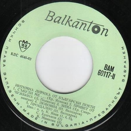 Грамофонните плочи "Интимна лирика от български поети" представляват един своеобразен поетичен албум. В него са подбрани предимно автори, които се изучават в училищата. Поетите са представени чрез техния интимен свят. Примерните творби, повечето от които са застъпени в учебната програма, звучат като изповеди. Интимният елемент и емоционалните багри са търсени в един по-широк аспект: любовта, майката, хората, дългът, Родината.