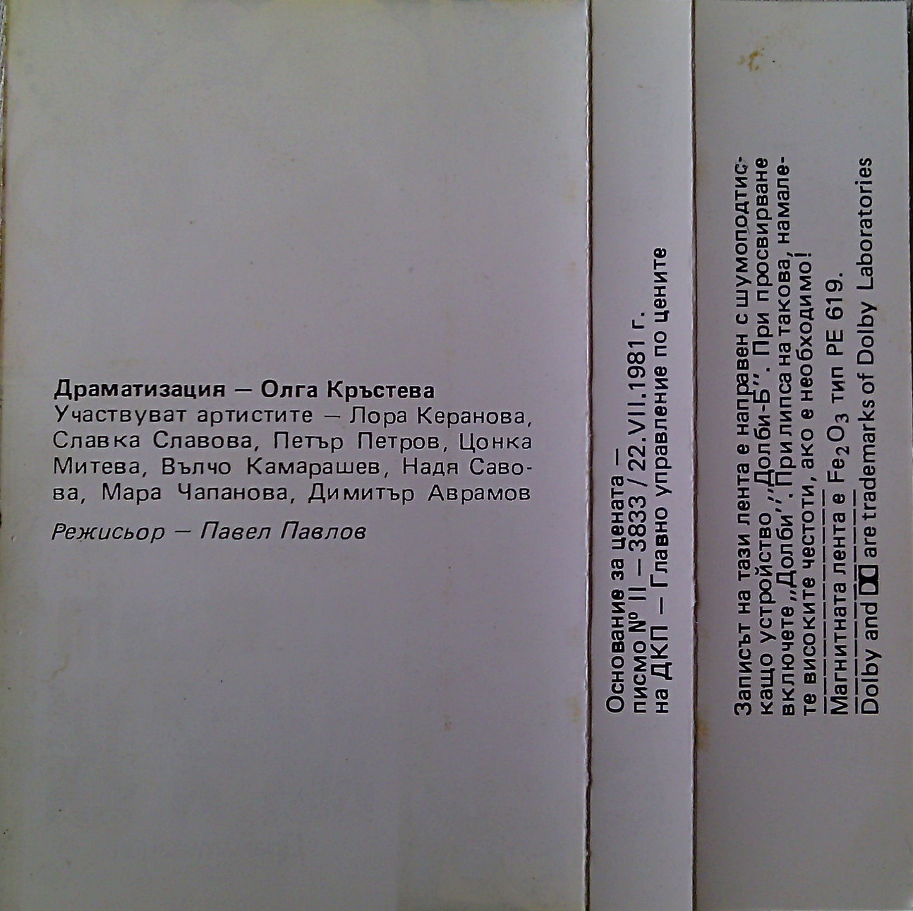 Участвуват артистите — Лора Керанова, Славка Славова, Петър Петров, Цонка Митева, Вълчо Камарашев, Надя Савова, Мара Чапанова, Димитър Аврамов