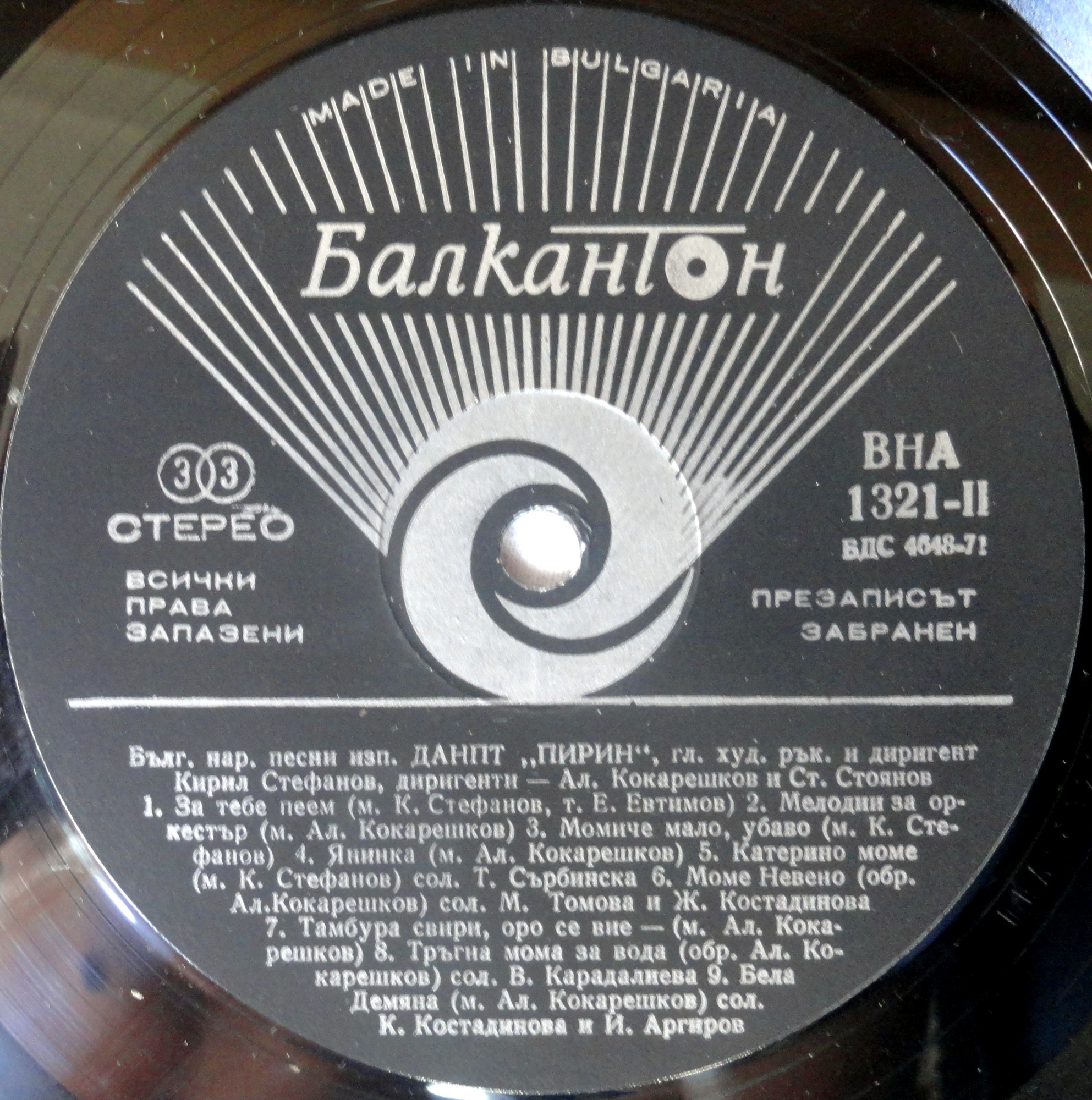 Български народни песни изпълнява Държ. ансамбъл за нар. песни и танци Пирин; глав. худож. ръководител и диригент Кирил Стефанов; диригенти Александър Кокарешков, Стоян Стоянов