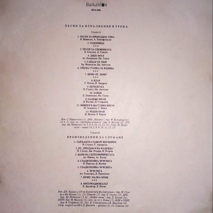 Изп. С. Парамонов (1), ДФА "Изворче", дир. М. Букурещлиев (2, 6, 7), вок. група "Сребърни звънчета", дир. А. Милева (3), ДРХ, дир. Хр. Недялков, съпр. Милена Трифонова - пиано (4, 5, 8, 9, 10, 11, 12, 13)