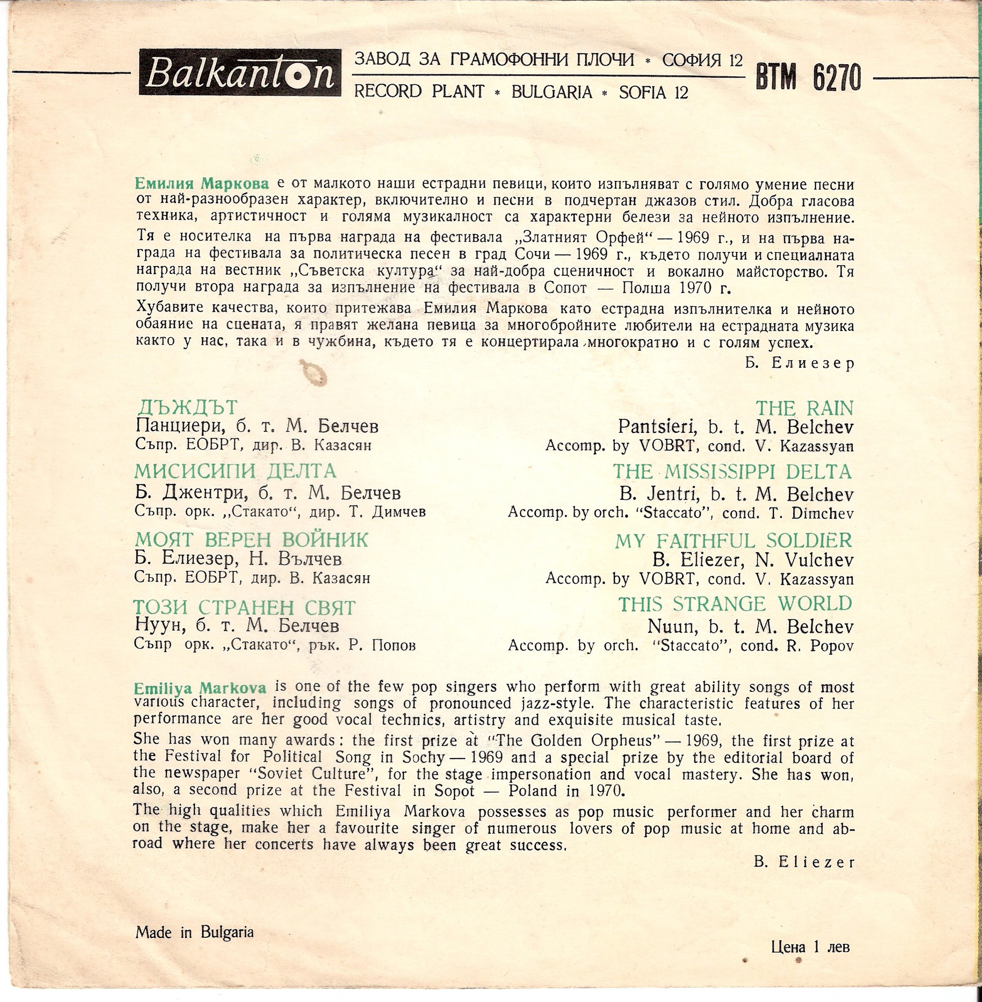 2. Мисисипи Делта (Б. Джентри, б. т. М. Белчев), съпр. орк. "Стакато", дир. Т. Димчев — 3.02
