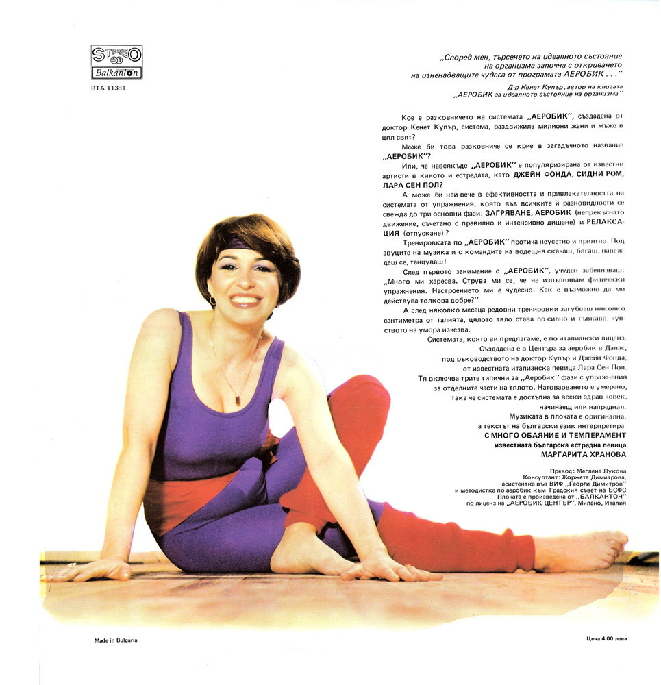 Системата, която ви предлагаме, е по италиански лиценз. Създадена е в Центъра за аеробик в Далас,под ръководството на доктор Купър и Джейн Фонда, от известната италианска певица Лара Сен Пол. Тя включва трите типични за „Аеробик" фази с упражнения за отделните части на тялото. Натоварването е умерено, така че системата е достъпна за всеки здрав човек, начинаещ или напреднал. Музиката в плочата е оригинална, а текстът на български език интерпретира С МНОГО ОБАЯНИЕ И ТЕМПЕРАМЕНТ известната българска естрадна певица МАРГАРИТА ХРАНОВА.