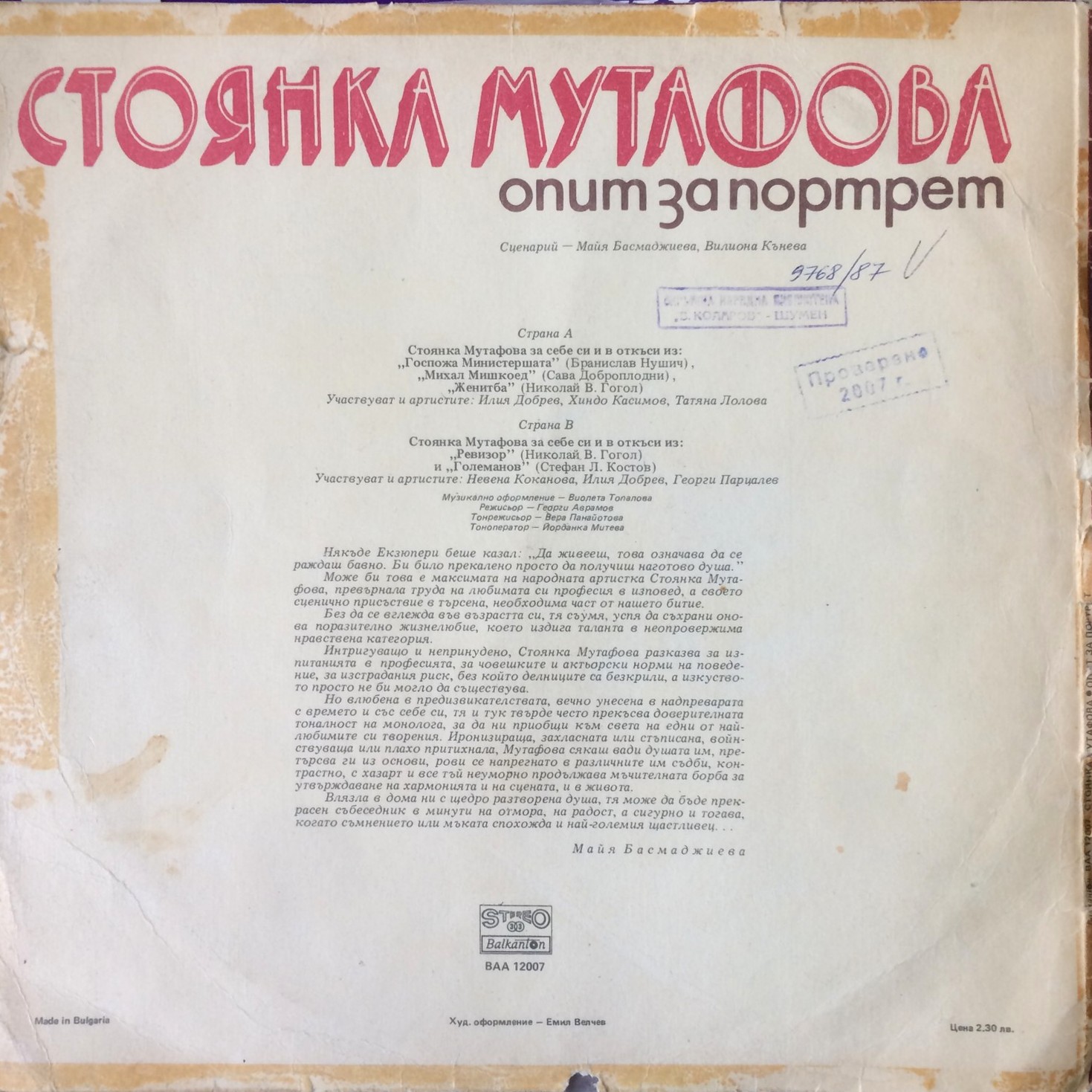 Стоянка Мутафова за себе си и в откъси из: "Госпожа Министершата" (Бранислав Нушич), "Михал Мишкоед" (Сава Доброплодни), "Женитба" (Николай В. Гогол). Участвуват и артистите: Илия Добрев, Хиндо Касимов, Татяна Лолова